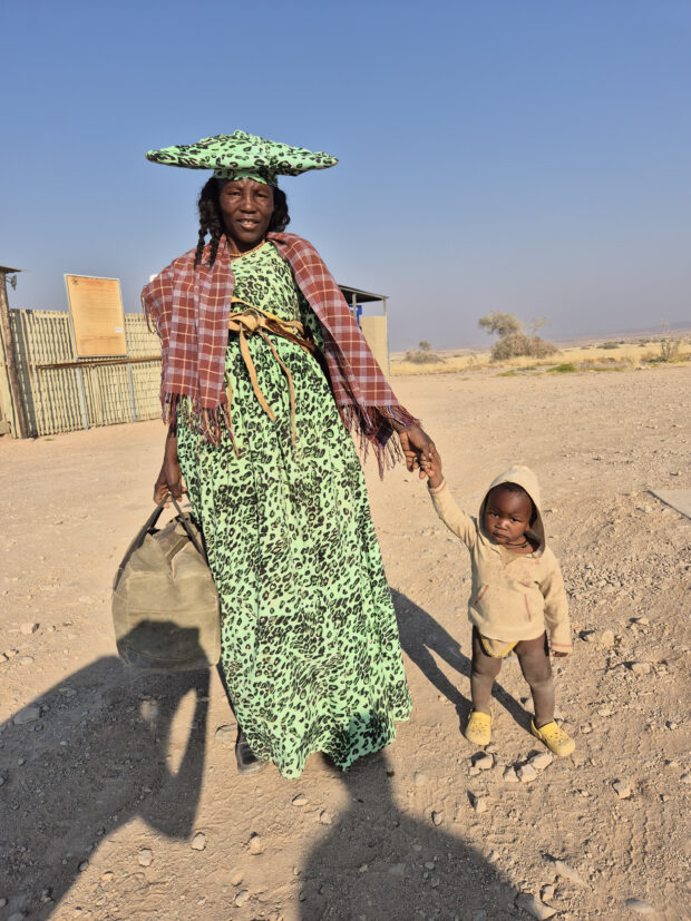 De Victoriaans aandoende dracht, de jurk van onze liftster, stamt nog uit de koloniale tijd toen Duitse missionarissen de Hererovrouwen verplichtten ‘zedelijke’ jurken te dragen. Als laatste punt van de koloniale taart, werd Namibië eind van de negentiende eeuw een Duitse kolonie, met als gevolg dat je er tot op de dag vandaag zuurkool kunt eten en er Konditoreien aantreft. Apfelstrudel in de woestijn. Ja bitte!